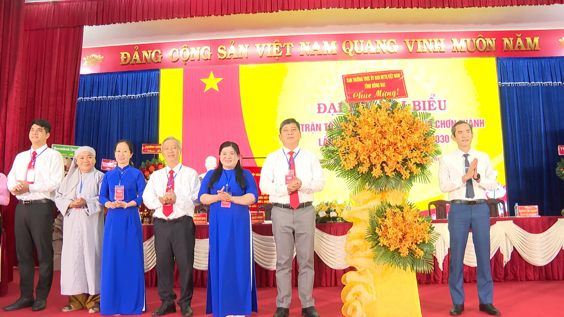 Bí thư Đảng ủy phường Chơn Thành Nguyễn Minh Bình, tặng hoa chúc mừng các Ủy viên Ủy ban Mặt trận Tổ quốc Việt Nam phường Chơn Thành khóa I, nhiệm kỳ 2025-2030, ra mắt đại hội
