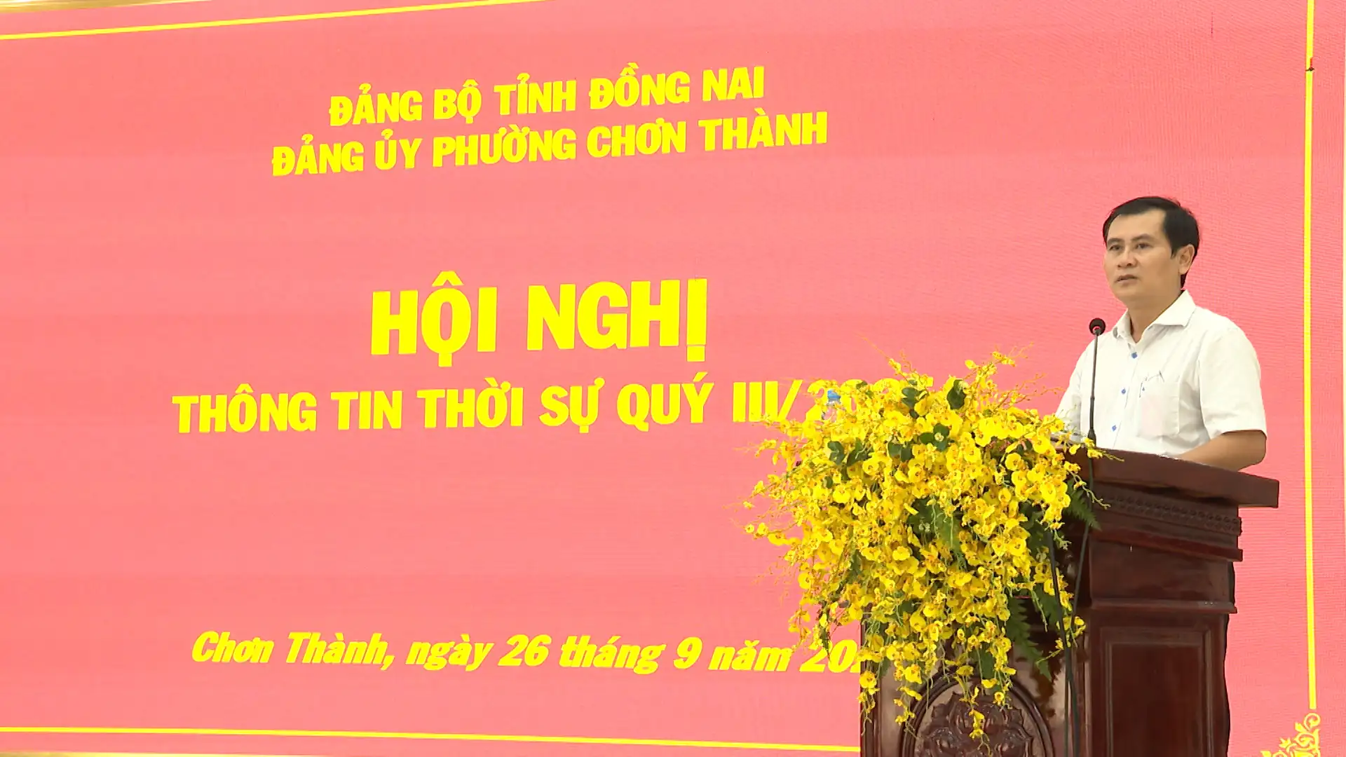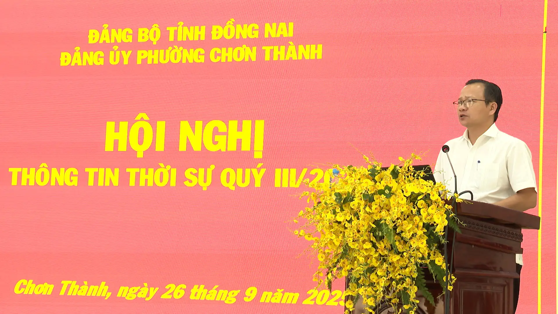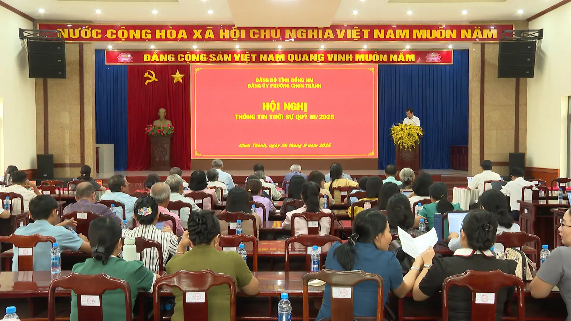 Chiều ngày 26-9-2025 Đảng ủy phường Chơn Thành, tỉnh Đồng Nai đã tổ chức Hội nghị thông tin thời sự quí III, năm 2025, đến toàn thể cán bộ, lãnh đạo, đảng viên của Đảng bộ các cơ quan Đảng, Đảng bộ cơ quan Ủy ban nhân dân phường và các chi, đảng bộ cơ sở, cùng các khu phố trên địa bàn phường.